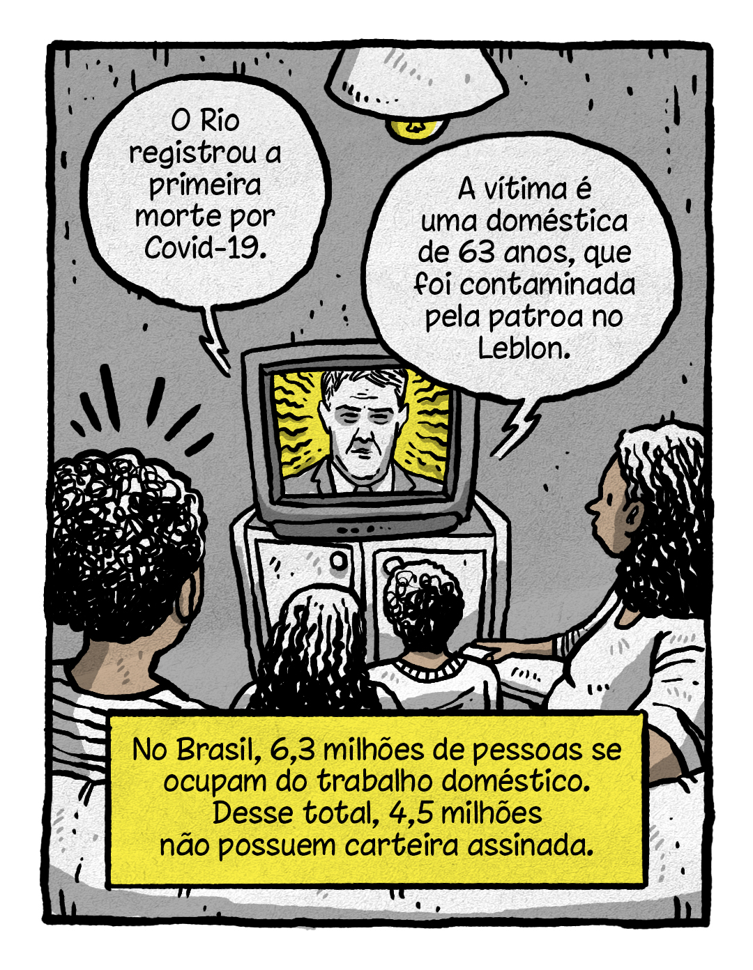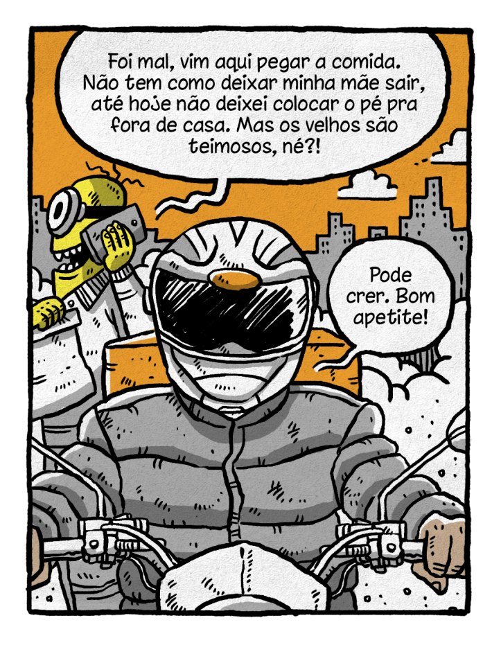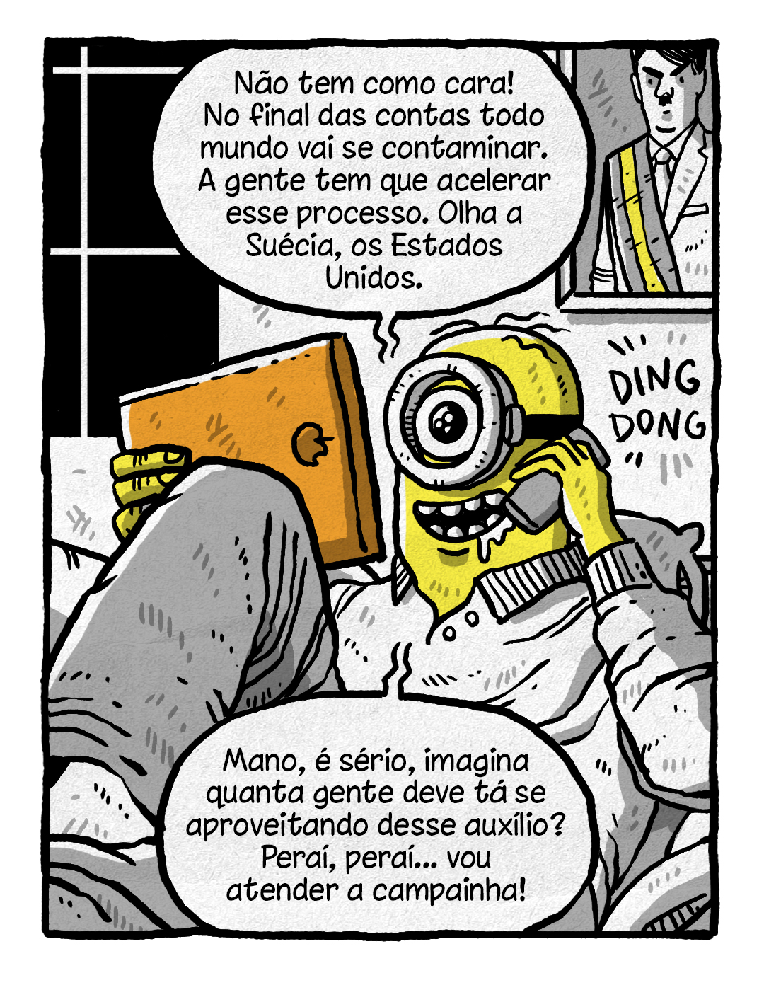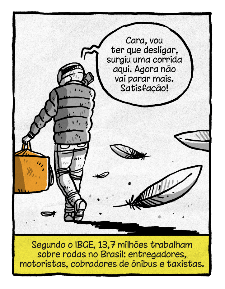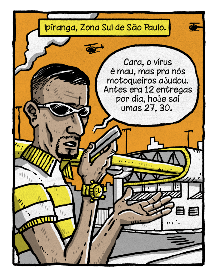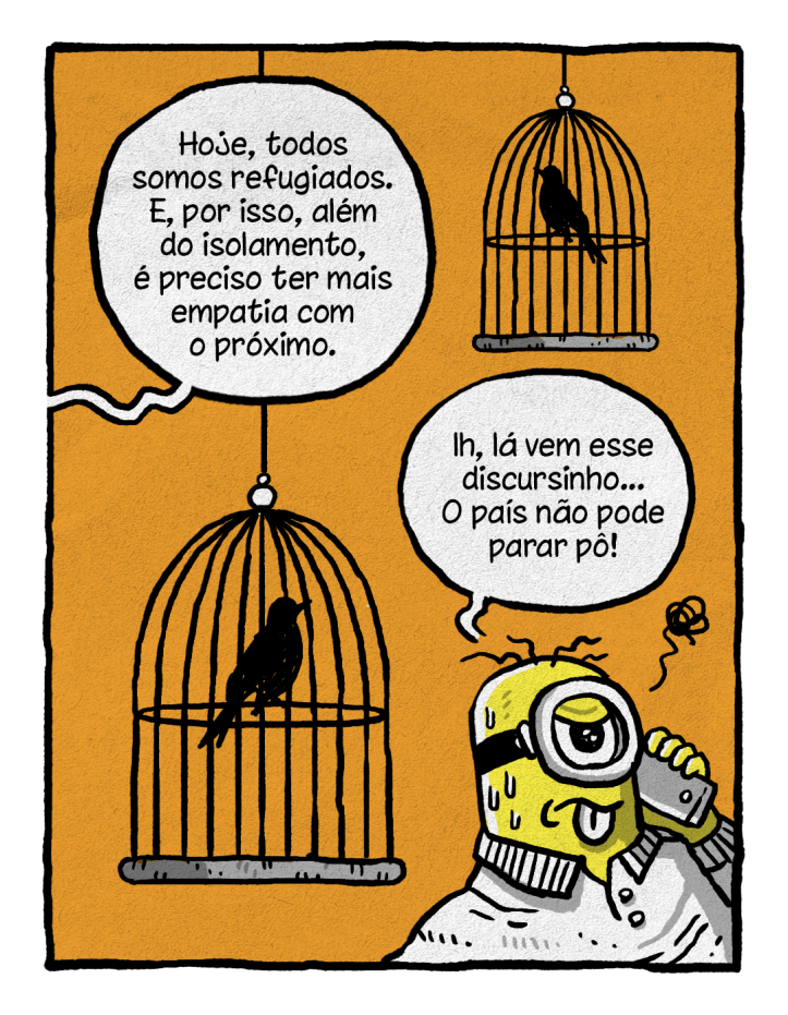 As consequências da pandemia de coronavírus atingem de forma desigual as diversas camadas da sociedade brasileira. Esse é o tema da reportagem em quadrinhos “O País Não Pode Parar”, que relaciona a forma como cada classe é atingida e sua reação à crise. Enquanto uns lutam para sobreviver, outros esperam a comida chegar até a porta de casa, de onde exigem a “volta ao trabalho”. A compreensão da crise aqui é aprofundada com dados e números que começam a mostrar a dimensão do que está acontecendo no Brasil. Em um cenário caótico de crise sanitária e omissão do governo, a reportagem traz a voz de imigrantes, trabalhadores de aplicativos e empregadas domésticas. Esse trabalho é mais uma parceria entre o jornalista Guilherme Weimann e o cartunista Vitor Teixeira. Os autores já publicaram diversos trabalhos juntos, como “O Inimigo da Vez” e “Tragédia Anunciada“.