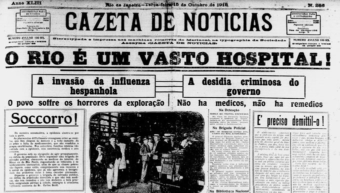 A doença chegou ao Brasil em setembro de 1918, num contexto de guerra mundial e grande devastação da Europa. O impacto foi sentido em especial no Rio de Janeiro, que mesmo sendo a capital do país, não tinha estrutura sanitária alguma para lidar com a pandemia. Nem a cachaça, nem os purgantes, nem todo tipo de receitas milagrosas foram eficazes contra a nova doença, e os leitos rapidamente se esgotaram nos hospitais. Um cenário de caos social se instaurou na cidade. Nelson Rodrigues, que tinha 6 anos na época, lembra da situação em uma de suas crônicas: