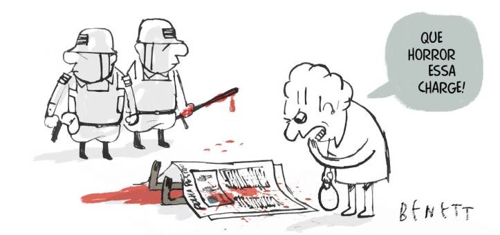 A intimidação veio da Defenda PM, uma associação de oficiais militares do estado de São Paulo que pediu um esclarecimento criminal à Folha de S. Paulo, jornal onde as charges foram publicadas. A entidade, fundada em 2016 e conhecida por abrigar a ala mais radical da corporação paulistana, considerou as imagens “constrangedoras” tanto para ela, quanto para seus 2.000 associados, e por isso entrou na Justiça. O pedido de esclarecimento criminal é o primeiro passo para uma ação penal propriamente dita. O cartunista Benett rebateu a intimidação acusando a censura: