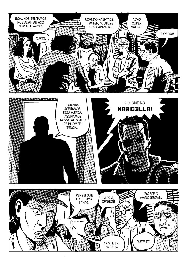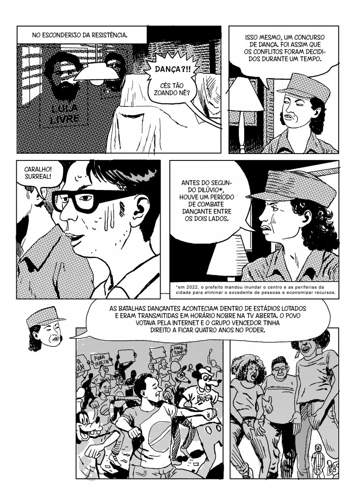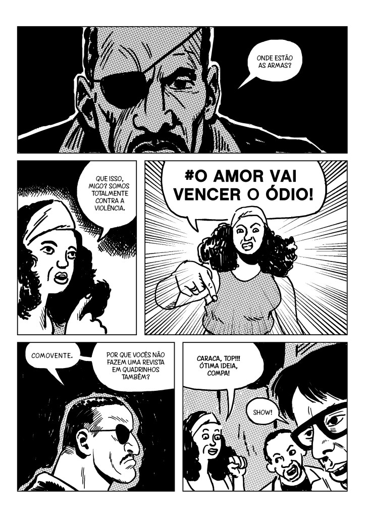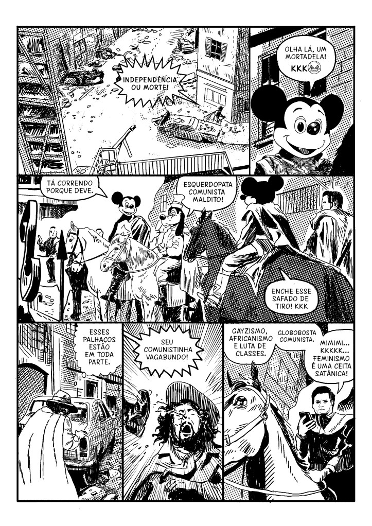 O quadrinista também retrata a “resistência” à catástrofe social, fazendo uma crítica à fragilidade e à confusão da esquerda em cenários de crise, que utiliza tuitaços e cirandas como ferramenta de “luta” contra dobermanns fascistas. Outra critica controversa é a forma como João discute a imposição dos quadrinhos comerciais norte-americanos na nossa cultura, ao passo que utiliza referências como Judge Dredd, e mesmo sendo um fã confesso de Jack Kirby e John Romita Jr.