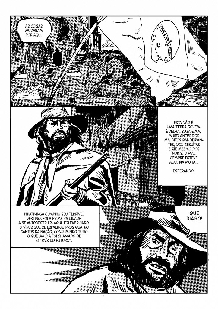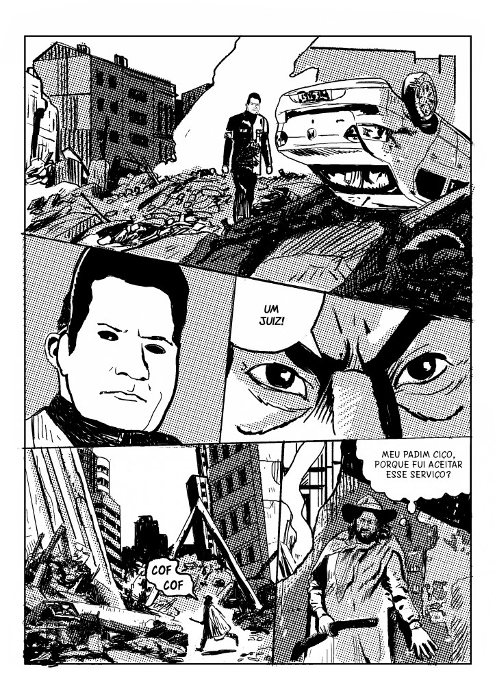 Nesse trabalho o quadrinista combina referências de filmes distópicos dos anos 90, como Fuga em Nova York e Cyborg – O Dragão do Futuro, e mistura ficção e realidade para mostrar o fundo do poço onde o Brasil se encontra atualmente. A cidade de São Paulo é o ambiente onde a narrativa se desenvolve, e é onde o protagonista, Antônio das Mortes – aquele mesmo do filme O Dragão da Maldade contra o Santo Guerreiro, de Glauber Rocha – se aventura entre os escombros de uma terra arrasada, habitada por sinistros vigilantes que ocultam suas identidades com máscaras do Sérgio Moro e do Mickey Mouse.