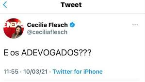 Cecília Flesch, uma jornalista da grande imprensa, tentou debochar do Lula falando “adevogados”. Com aquele ar de quem chama o ex-presidente de analfabeto e fica chocada com a importância que o homem tem, típico dos jornalistas de direita. Pois saiba, Cecília, que quando o Lula fala, soa como música em nossos ouvidos. O mesmo não dá pra dizer sobre fulanos tipo Cássio Nunes, o ministro de Bolsonaro, chamando a pobre Carta Magna de Carta Magda, ao tentar barrar a suspeição do Moro. Alguém assistiu muito “Sai de Baixo” com a vó, ein.