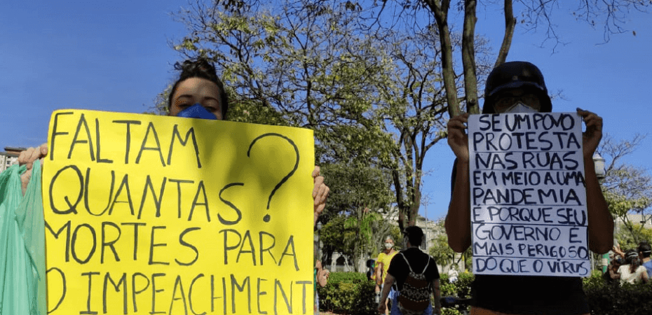 Em um protesto marcado pelo distanciamento, necessário devido à pandemia, muitos cartazes estampam mensagens diversas de denúncia e revolta contra o governo.
