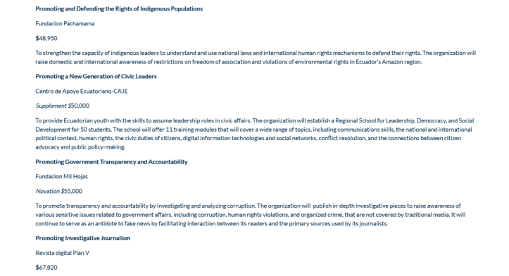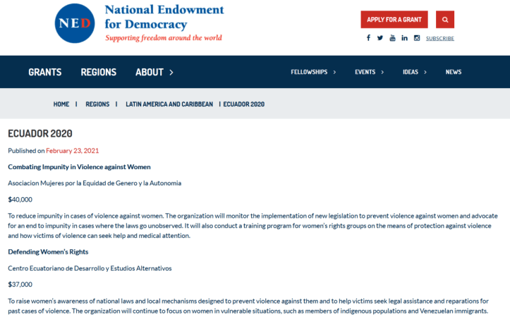 Em complemento às dezenas de milhões de dólares que a USAID gastou no Equador para ajudar a construir essa oposição de pseudoesquerda, houve doações do NED (National Endowment for Democracy), outra frente da CIA. O NED financiou vários dos principais políticos anticorreístas, focalizando principalmente grupos indígenas, ambientalistas e de mulheres, junto com a mídia de oposição.