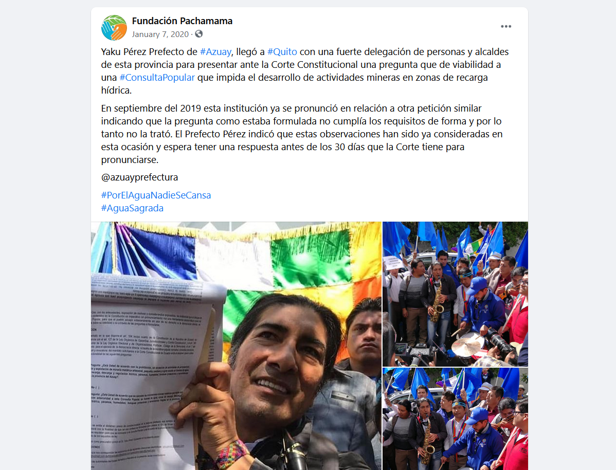 Um caso exemplar e primordial de organização de tubo de ensaio apoiada pelos Estados Unidos no Equador é a Fundação Pachamama. Com a ajuda de doações anuais do NED que datam de anos atrás, a fundação tem atacado implacavelmente Correa, chamando-o de “extrativista” autoritário, enquanto constantemente promove Yaku Pérez como um nobre defensor do meio ambiente.