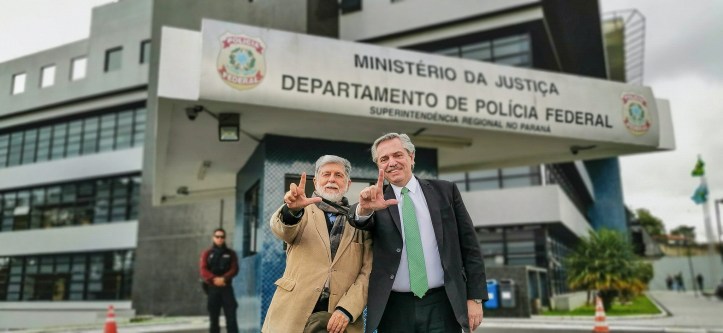 Alberto Fernández, na época ainda candidato à Presidência da Argentina, e Celso Amorim, ex-chanceler, chegam à Superintendência da Polícia Federal em Curitiba para visitar o ex-presidente Lula. Foto: Ricardo Stuckert