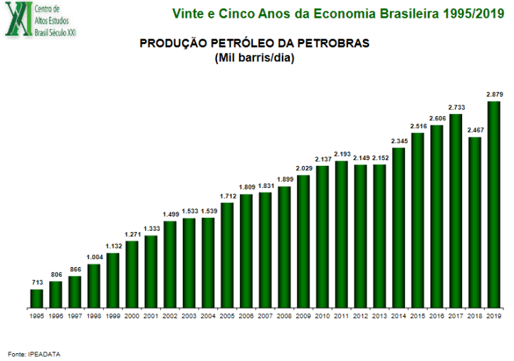 Primeiramente, deve-se notar que a produção de petróleo da Petrobrás cresceu significativamente durante os governos de Lula e de Dilma (gráfico abaixo). Esse dado é importante ser apresentado logo no início para provar que o problema não era de falta de produção, mas sim da política econômica de gestão da empresa. Fora isso, entre 2010 e 2014, foi tomada a decisão de manter os preços internos abaixo do preço internacional, apesar de uma elevação no preço mundial do petróleo. O fruto de tal estratégia foi positivo, e a Petrobrás registrou uma geração de caixa de 28 bilhões de dólares em 2010 e de 33 bilhões em 2011. No entanto, a partir de 2016, ficou decidido que o preço seria elevado para acima dos internacionais e a empresa acaba perdendo o mercado interno e não consegue mais gerar caixa, mesmo com uma maior produção de petróleo, por conta de suas refinarias ociosas. Não é loucura concluir, então, que o que causou o prejuízo na Petrobrás foi uma má gestão interna, não o governo do PT.