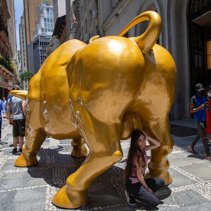 A Bolsa de Valores de São Paulo – que desde 2017 parece atender por “B3” – inaugurou, na última terça-feira (16), uma escultura de um gigantesco touro dourado na calçada diante de seu edifício, no centro da capital. A obra seria uma referência àquela existente em Nova York, próxima a Wall Street e símbolo do mercado financeiro em sua metrópole mais representativa. Segundo aquela que outrora se chamava Bovespa, a obra “simboliza o mercado financeiro e a força do povo brasileiro” e “representará especialmente as características da população brasileira”. Para o presidente da “B3”, Gilson Finkelsztain, “o Touro de Ouro representa a força e a resiliência do povo brasileiro. A B3 está trazendo esse novo símbolo para valorizar não apenas o centro de São Paulo, mas o desenvolvimento do mercado de capitais do Brasil”.