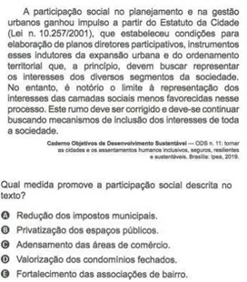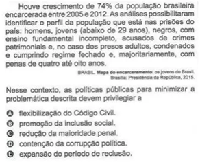 Além das questões “pega-comunista”, algumas contavam com opções de resposta que, num contexto geral, estariam claramente erradas, mas, no Brasil de Bolsonaro, nunca se sabe. Em uma questão, sobre o aumento da população encarcerada, assume-se que a resposta certa é a promoção da inclusão social, mas não assustaria ninguém se, no gabarito do governo, a solução fosse a redução da maioridade penal, a panaceia dos conservadores para qualquer problema ligado à criminalidade. Outra questão, essa sobre a participação social no planejamento da cidade, tem tudo que a direita gosta: redução de imposto, valorização dos condomínios fechados e privatização do bem público.