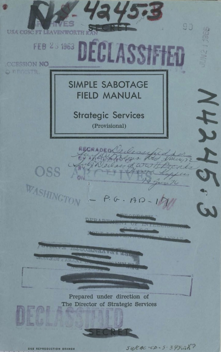 Com prefácio de ninguém menos que o criador da CIA, William J. Donovan, então à frente do que se chamava Office of Strategic Services [Escritório de Serviços Estratégicos], a peça foi editada ainda durante a Segunda Guerra Mundial, em 1944, e se destinava sobretudo a agentes infiltrados em países da Aliança do Eixo – como Alemanha, Itália e Japão –, tendo sido usado evidentemente na Guerra Fria contra a União Soviética e os demais países comunistas nas décadas seguintes.