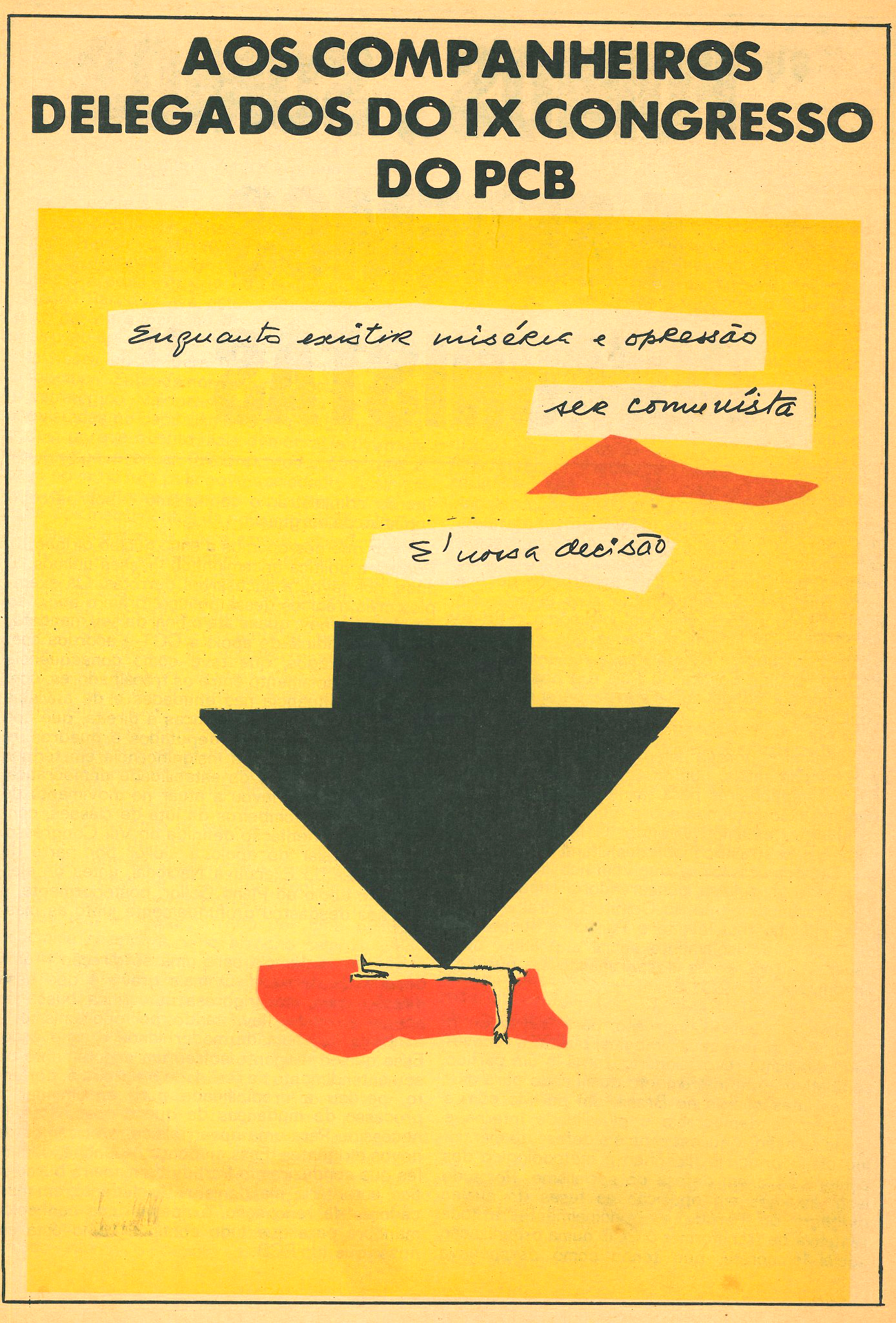 Diante da queda iminente da União Soviética, em junho de 1991, os grupos ditos “renovadores” assumem o poder no PCB e preparam sua tentativa de liquidá-lo por meio de uma transformação num partido social-democrata. Niemeyer se coloca frontalmente contra o movimento, mandando imprimir um cartaz com uma mensagem contundente “aos companheiros delegados do IX Congresso do PCB”, com fundo amarelo e uma seta negra esmagando um corpo morto sobre uma poça de sangue. Manuscrito, o recado: “Enquanto existir miséria e opressão, ser comunista é nossa decisão”.