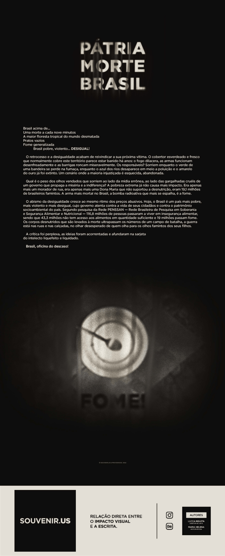 Qual é o peso dos olhos vendados que sorriem ao lado da mídia errônea, ao lado das gargalhadas cruéis de um governo que propaga a miséria e a indiferença? A pobreza extrema já não causa mais impacto. Era apenas mais um morador de rua, era apenas mais uma Dona Maria que não suportou a desnutrição, eram 19,1 milhões de brasileiros famintos. A arma mais mortal no Brasil, a bomba radioativa que mais se espalha, é a fome.