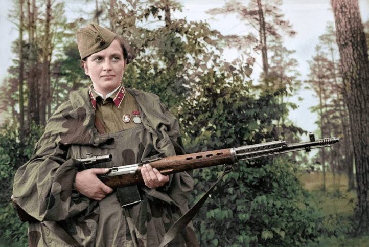 Muitas mulheres eram também designadas para a artilharia. Algumas se destacaram como excepcionais atiradoras de elite. A maior delas, sem dúvida, foi Lyudmila Pavlichenko, conhecida como a Dama da Morte, por ter livrado o nosso planeta de 300 nazistas, em menos de um ano de combate. No total, as mulheres-snipers mandaram para o inferno mais de 11.200 oficiais e soldados do Führer.